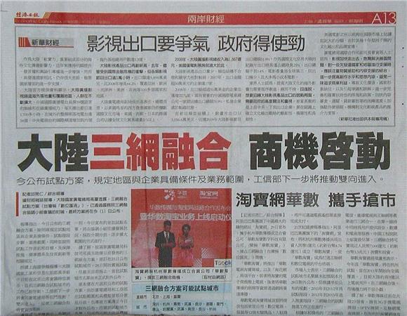 據財經雜誌報導,大陸國家廣電總局高層透露,三網融合試點方案(台灣稱「數位匯流」),已通過國務院三網融合協調小組會議的討論,最終方案將在今(1)日公布。
