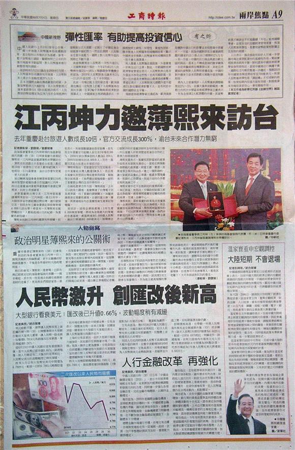 日本和新加坡各大報卅日都在頭版報導台海兩岸簽署兩岸經濟協議(ECFA),並稱此一協議是兩岸分治六十多年後首度的歷史性共識,超越經濟意義。