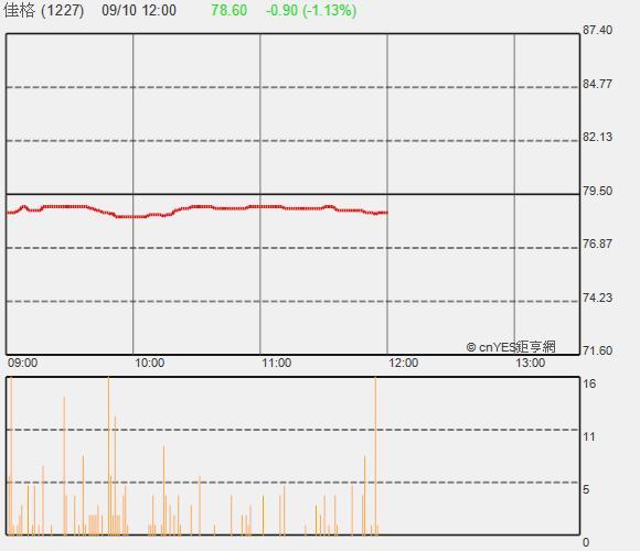 佳格今天收盤下跌1.4元,收在90元,成交量1880張。