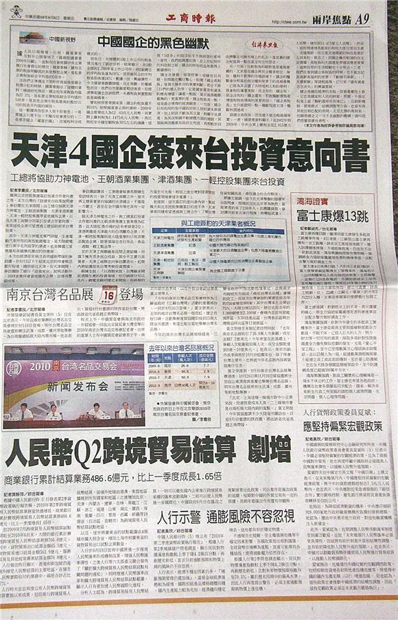 繼與北京控股集團簽訂投資合作意向書之後,本次台灣的「陸資來台政策說明會」參訪團在天津期間,由工總分別與天津力神電池、王朝酒業集團、天津津酒集團、天津一輕控股集團等當地國有企業,以及天津工商聯分別簽訂投資合作意向書,未來這些企業可望透過工總協助前來台灣投資。