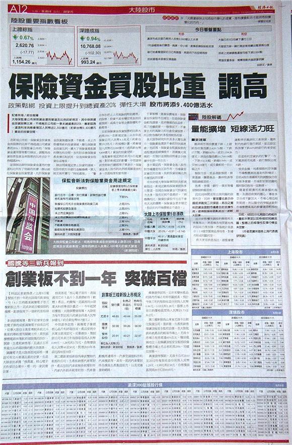 大陸保監會公布保險資金運用管道及比例的新規定,其中保險資金投資股票比率,不得高於公司前一季末總資產的20%。專家認為,這項利多消息會增加人民幣近2,000億元(約新台幣9,400億元)資金的投資空間。