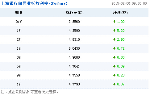 上海銀行間同業拆放利率(Shibor)顯示,隔夜Shibor報2.8560%,下跌1.00個基點。1周Shibor報4.3590%,下跌5.30個基點。3個月Shibor報4.9080%,下跌0.80個基點。