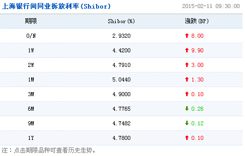 上海銀行間同業拆放利率(Shibor)顯示,隔夜Shibor報2.9320%,上漲8.00個基點。7天Shibor報4.4200%,上漲9.90個基點。3個月Shibor報4.9000%,上漲0.10個基點。