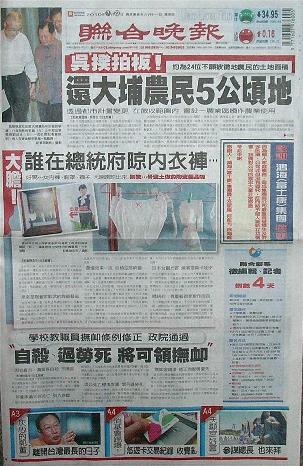 誰那麼大膽?竟敢在總統府晾內衣褲!這兩天走過總統府一樓紀念品中心前長廊的人,莫不為眼前的景象感到驚愕。就在人來人往的走道上,竟然有人敢晾上理應屬私密物品的粉色女性內褲、胸罩,還有臭襪子,讓經過的官員、參觀的民眾,女的瞠目結舌,男的臉紅心跳,離譜的是,竟然沒有任何人制止!