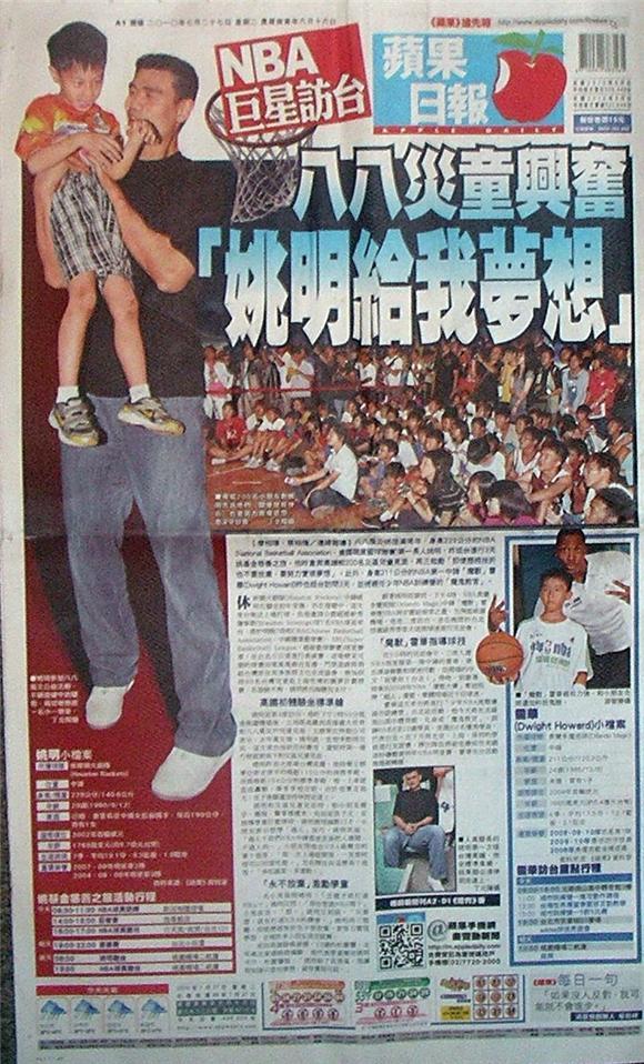 ◆蘋果日報:NBA巨星訪台 八八災童興奮「姚明給我夢想」