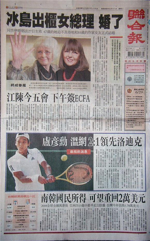 冰島同性戀婚姻法廿七日生效,冰島的全球首位出櫃女總理尤漢娜‧西古札妥提當天就迫不及待與同居多年的女友正式結婚,成為全球第一位任內和同性戀人結婚的國家領導人