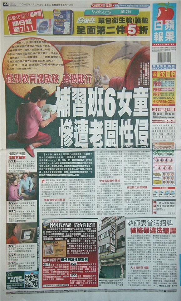 ◆蘋果日報:補習班6女童 慘遭老闆性侵