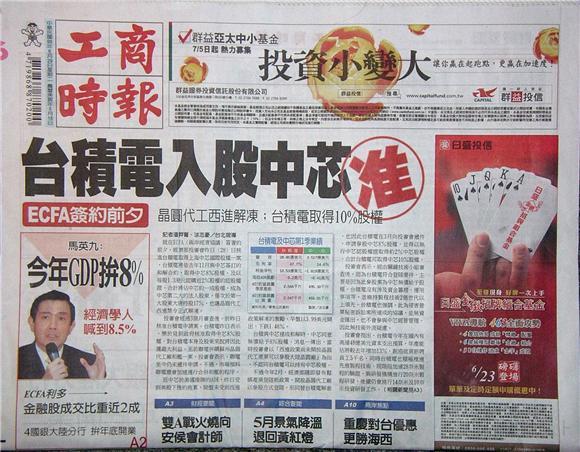 就在ECFA(兩岸經濟協議)簽署的前夕,經濟部投審會昨日(28)日核准台積電取得上海中芯國際股權一案,台積電將依去年11月與中芯簽訂的和解合約,取得中芯8%股權,及以每股1.3港元認購近2%股權的認股權證,合計將佔中芯約一成股權,成為中芯第二大的法人股東,僅次於第一大股東大唐控股17%,也讓晶圓代工西進禁令正式解凍。