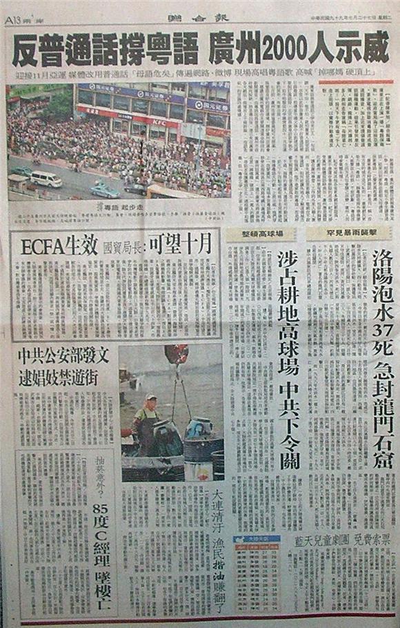 廣東正在上演一場「粵語保衛戰」,政府當局為了迎接亞運,要求電視台取消粵語改成普通話播音,加上近來提倡普通話種種運動,結果引發民眾反彈,網路、微博上一片譁然,多人奔相走告宣稱「母語要亡啦!」前天下午更有逾二千人走上街頭,以實際行動表達反對。