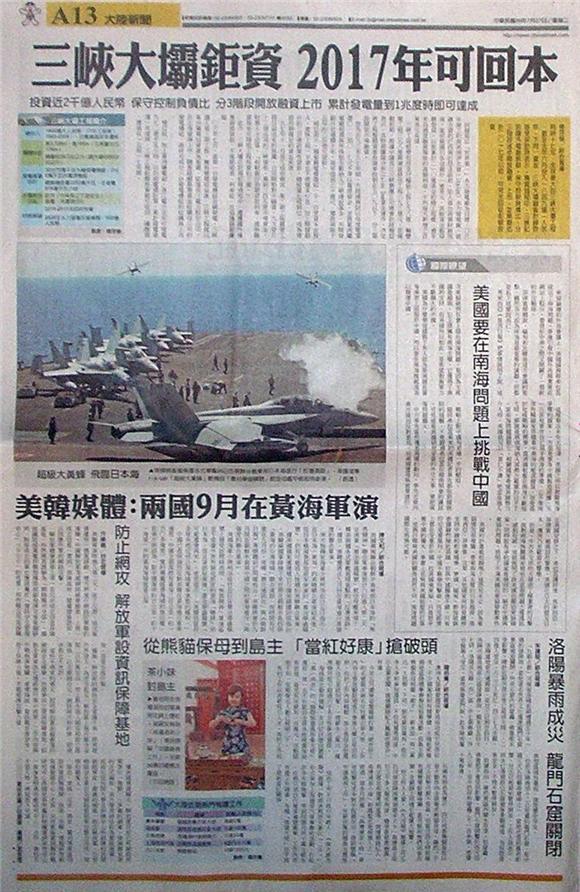 台灣主要報紙大陸版要聞標題一覽 (7月27日)