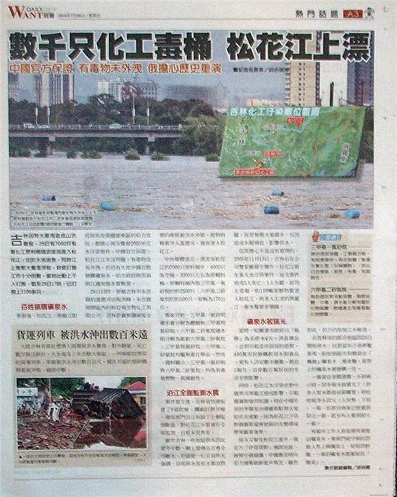 吉林因特大暴雨造成山洪暴發,28日有7000只有毒化工原料桶隨波逐流進入松花江,由於水流湍急,同時江上集聚大量漂浮物,致使打撈工作十分困難,當地出動上千人打撈,截至29日17時,已打撈上1100多只。