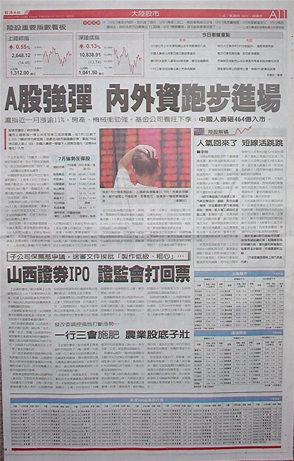 滬市上證綜指一掃上半年狂掉三成的陰霾,從7月2日創下2,319.74點的年內新低點,到最近A股市場連續反彈,滬指7月迄今已經上漲11.55%,中國人壽更一舉砸下人民幣百億元(台幣464億元)入市。