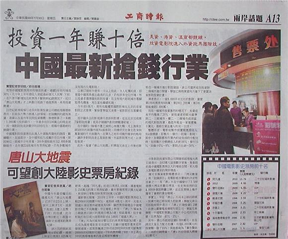 近年中國電影票房年均增長快速,連續5年年均增長30%。光今年上半年總收入便超過46億元人民幣(下同)。在片源不斷增加及新票房不斷刷新紀錄情況下,近日「唐山大地震」才上映數日就創下過億票房,再亮投資熱潮。
