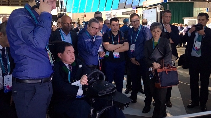 徐旭東特別到愛立信展館親自體驗現網 5G 遠端駕駛,操作位於巴塞隆納會場外 50 公里的一輛車,透過觸覺回饋技術和 5G 的超低時延特性,在駕駛中即時感受到路況包括路面起伏,進行加速與煞車等情境。