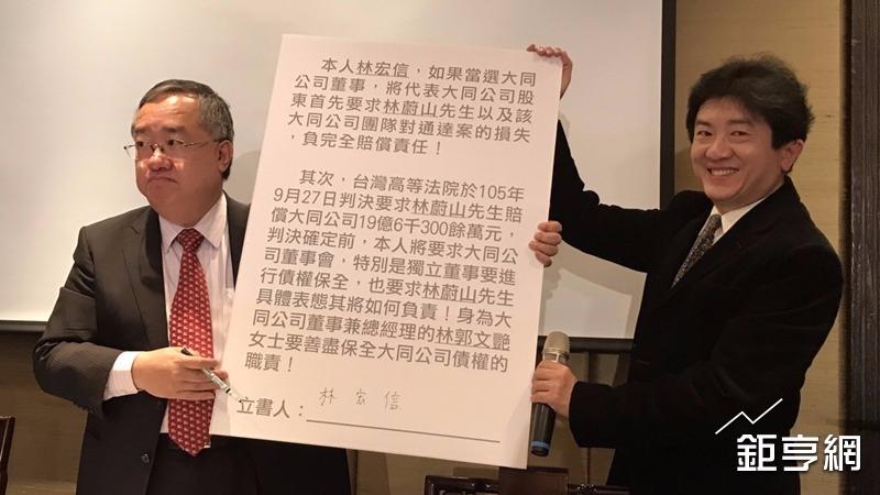 林宏信並在記者會上直接立書表態,若當選大同董事後首要任務就會向林蔚山索賠,他表示,如果當選大同公司董事,第一件事將代表大同公司股東首先要求林蔚山以及大同公司團隊對通達案的損失,負完全賠償責任,這可以替大同帶來每股純益 1 元的效益。