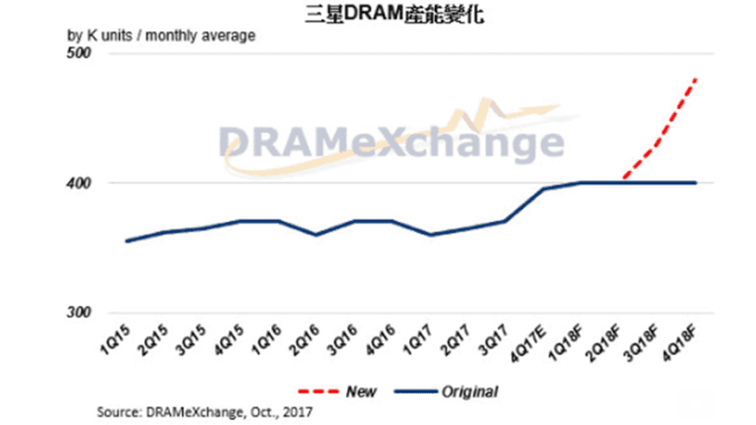 DRAMeXchange 指出,三星有意將其平澤廠二樓原定興建 NAND 的產線,部分轉往生產 DRAM,並全數採用 18nm 製程。加上原有 Line17 還有部份空間可以擴產,預計三星最多可將 2018 年 DRAM 產出量達到 80-100K,也代表三星的 DRAM 產能可能由 2017 年底的 390K 一口氣逼近至 500K 的水準,將帶動三星明年位元產出供給量由原本預估的 18% 成長上升至 23%。