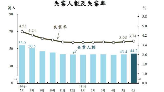 主計總處今 (22) 日公布 6 月我國失業率為 3.74%,較上月上升 0.06 個百分點,並創 8 個月來新高,反映社會新鮮人投入職場的季節性因素影響;上半年失業率平均為 3.66%,年減 0.27 個百分點,顯示相較於去年疫情衝擊勞動市場的狀況,已明顯緩和。
