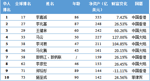 居2015華人富豪榜首位的是香港富豪李嘉誠,凈資高達333億美元;香港富豪李兆基以248億美元的凈資居第二名,萬達董事長王健林以242億美元的凈資額位居第三。