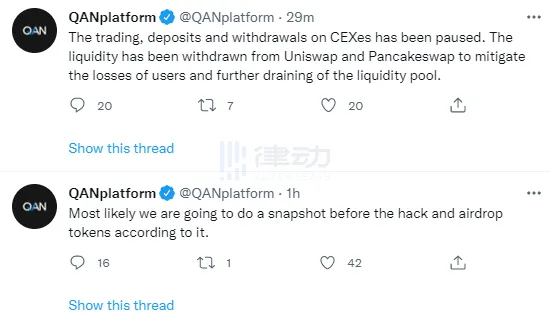 10 月 11 日,抗量子計算攻擊的 Layer1 區塊鏈 QANplatform 離線的橋接智能合約被攻擊,攻擊者已成功竊取 Token。官方提醒用戶不要執行任何與 QANX Token 相關的交易。目前 QANX 價格短線跳水跌超 93%。 當日,QANplatform 發文稱可能會對攻擊前狀態進行快照,之後空投新 Token。