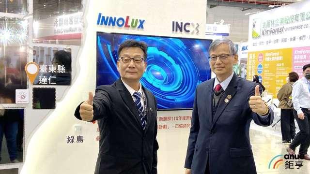 黑五電視銷售量平價跌,群創總座楊柱祥(右):庫存回歸正常有助明年拉貨。(鉅亨網記者劉韋廷攝)