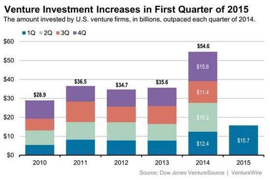 道瓊斯風險資源的數據顯示,2015年第一季度,美國風險投資總額達到157.2億美元,略高於去年第四季度,但較2014年第一季度大幅增長27%。之前的最高記錄生於2000年第四季度,總額達到197億美元。