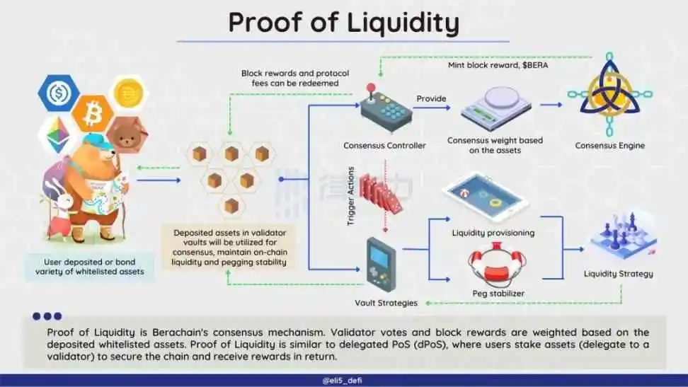 可以簡單理解為,激勵驗證者將 BTC、ETH 和穩定幣等白名單資產質押在驗證器保險庫上,與 dPoS 類似,用戶可以將存款委託給特定的驗證者,為鏈上協議提供流動性,並收取一部分 DeFi 協議收入和 $BERA 作為回報。存款越多,獎勵就越多。這能為 Berachain 上的 DeFi 帶來豐富的流動性。