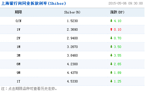 上海銀行間同業拆放利率(Shibor)顯示,隔夜Shibor報1.5230%,下跌4.10個基點;7天Shibor報2.3690%,上漲0.10個基點;3個月Shibor報3.8460%,下跌3.55個基點。