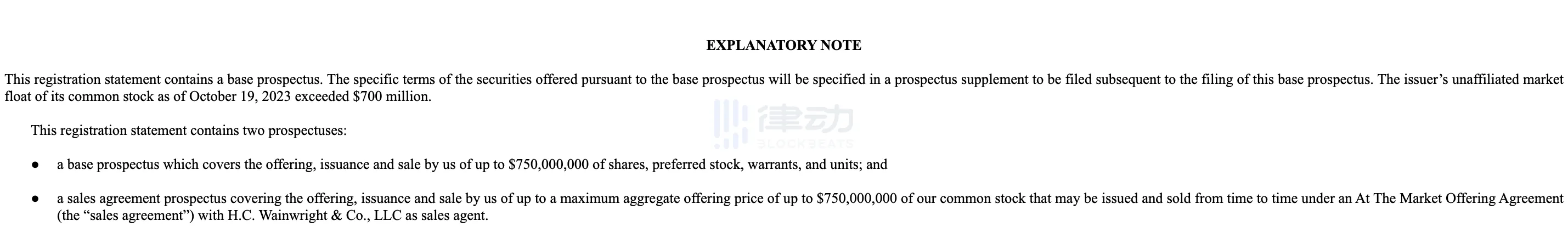 10 月 27 日,比特幣礦企 Marathon Digital 向美國 SEC 提交 S-3 表格,計劃通過混合股權發行募集最多 7.5 億美元。Marathon Digital 表示:「我們可能會不時地在一項或多項發行中,按照在每次發行時確定的價格和條款,出售普通股、優先股、認股權證或者這些證券的組合,以獲得最多 7.5 億美元的初始發行總額。」