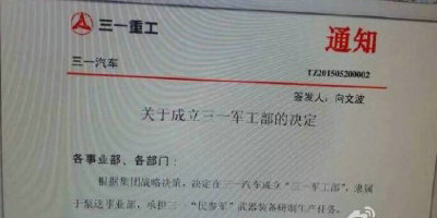 據新浪微博網友@三一巨人爆料,三一重工(600031,股吧)拿到軍工準入證,將成立軍工部。