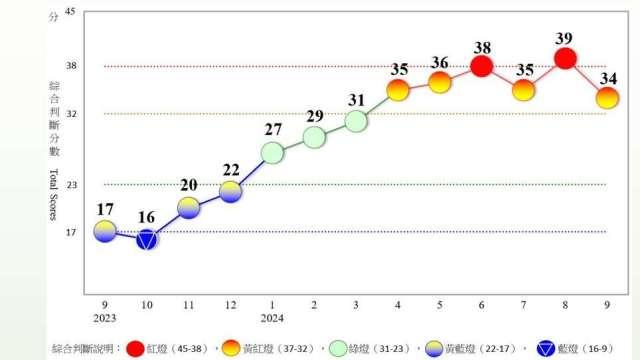 9 月景氣對策信號綜合判斷分數為 34 分,觀察 9 項構成項目中,海關出口值、批發、零售及餐飲業營業額均由紅燈轉呈綠燈,分數各減少 2 分;製造業營業氣候測驗點則由綠燈轉呈黃藍燈,分數減少 1 分;其餘 6 項燈號維持不變。