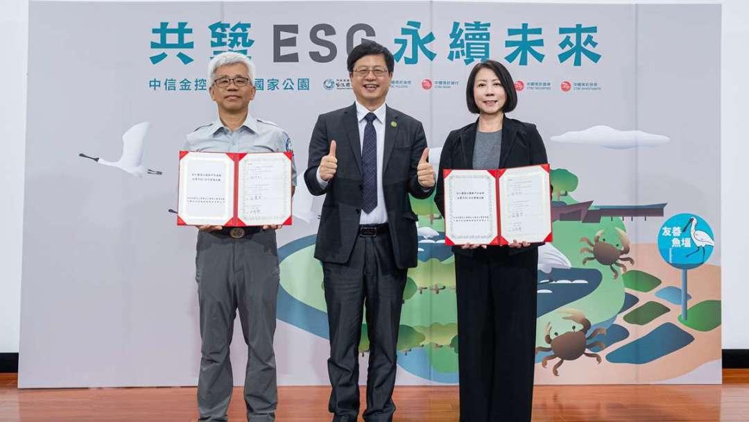 在內政部國家公園署署長王成機的見證下,由中國信託金控總經理高麗雪、台江處處長謝偉松代表簽署 MOU。中信金控總經理高麗雪表示,中信金控維護生物多樣性責無旁貸,此次號召中信銀行、台灣人壽、中信證券、中信投信四家子公司支持台江國家公園棲地營造,讓私人魚塭成為「人、魚、鳥共好」的永續棲地。