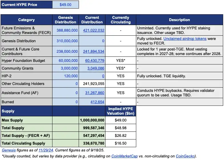要理解這個提案,先得看清 HYPE 目前的供應結構。根據 Jon 提供的數據表,在 49 美元(他們提案時的 HYPE 價格)的價格下,HYPE 總共 10 億枚的盤子裡,實際流通的只有 3.37 億枚,對應 165 億美元市值。