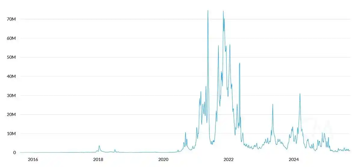 自 2020 年以來,代幣化資產的價值和穩定幣的交易量已增長 100-1000 倍。然而,Tom Lee 的論點卻從根本上誤解了以太坊的價值累積機制——他讓人誤以為網路手續費會同比攀升,但實際上以太坊的手續費收入卻仍停留在 2020 年水準。