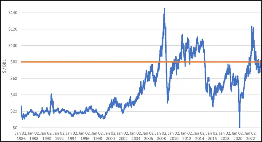 石油本質上是一種商品。經過通膨調整後的真實石油價格在一個世紀以來一直保持在同一區間內,偶爾會出現波動並回歸原位。
