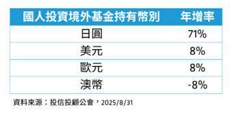自美國 2022 年啟動升息循環以來,與美國貨幣政策走勢不同調的日圓持續走貶,帶動台灣一波日圓換匯潮。據投信投顧公會統計,截至 8 月底,國人持有日圓計價境外基金金額約新台幣 794 億元,年增 71.2%,更較三年前成長逾五倍。相較之下,國人持有美元與歐元計價境外基金金額,僅分別較去年同期成長 7.6% 與 7.5%,澳幣則下滑 8.1%1。聯博投信表示,台灣人喜愛赴日旅遊,不少人習慣趁匯率低點搶進日圓,造成滿手日圓現象,若能透過日圓級別基金活化閒置資金,不僅可望提高資金效益,還能進一步放大旅遊基金。