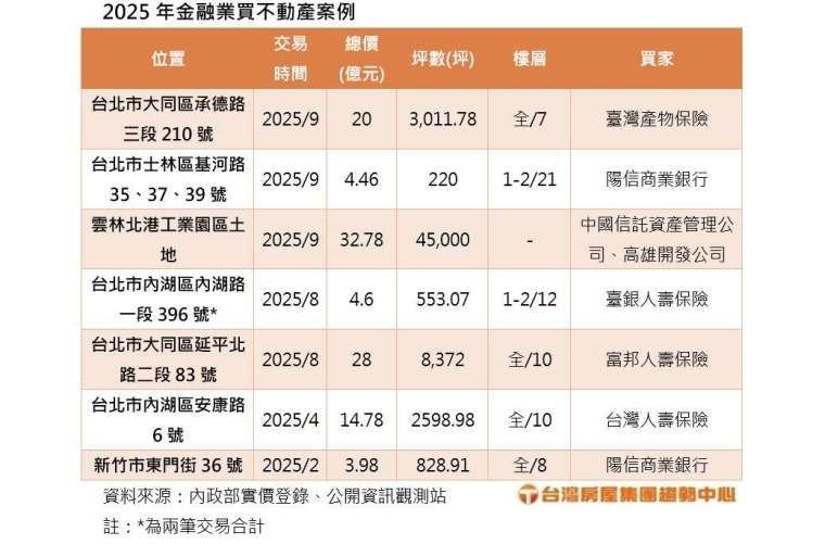 2025 年銀行與保險業積極投資境內大型不動產,房仲業者指出, 2025 年金融業者投資金額最高的交易是雲林北港工業園區土地,由中信資產管理公司與高雄開發公司以合資方式購入,總價約 32.78 億元土地,土地坪數高達 4.5 萬坪,而在台北市中心,保險業則鎖定整棟商辦產品。