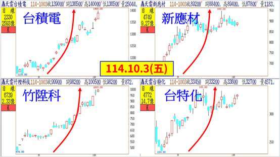 9/29 文章推薦的台積電與 AI 產業個股,期間也有不錯的表現,如:竹陞科 (6739-TW)、鴻海(2317-TW)、廣達(2382-TW)、緯穎(6669-TW)、國精化(4722-TW)、尖點(8021-TW)、奇鈦科(3430-TW) 等等。其餘個股,則隨時等待再度轉強。台股長期多頭,中秋佳節之後,投資朋友無需擔憂,向下變盤。甚至,拉回才是新布局的好機會,秋節過後,台積電與 AI 供應鏈還是首重之重。