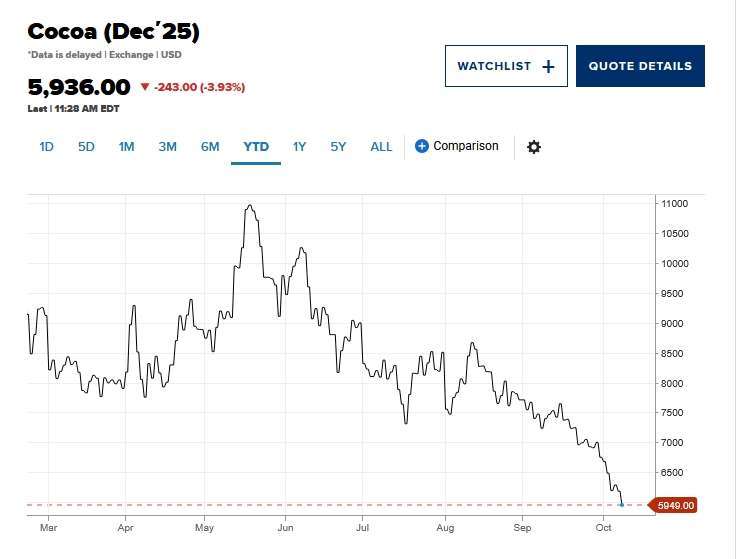 可可價格近期大幅走跌,美國 12 月交割的可可期貨周三下跌 3.9%,報每公噸約 5,936 美元,延續上周高達 10% 的跌幅,價格觸及自 2024 年初以來近 20 個月低點。這一波急跌中斷了過去兩年持續走高的態勢,不過投行警告,市場的「極端超賣」恐引發新的風險。