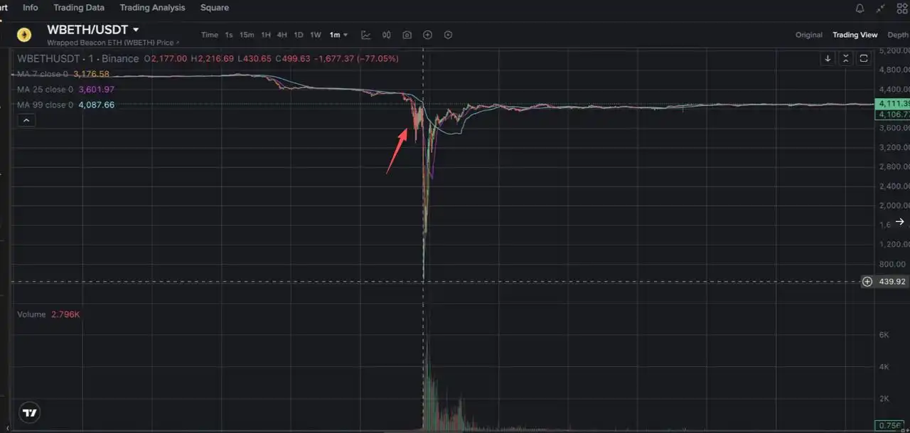 由於 Binance 統一保證金系統允許跨資產抵押,這導致 wBETH 和 BNSOL 部位被強制平倉。而強制平倉的操縱在 wBETH 和 BNSOL 現貨流動性很差(wBETH 日均交易深度僅約 2,000 ETH)的情況下導致二者的現貨價格短時脫錨 20%+,而 Binance 這個時候抵押價值的預言機還拿的是現貨價格,導致抵押物極度縮水,引發市場極度縮減。