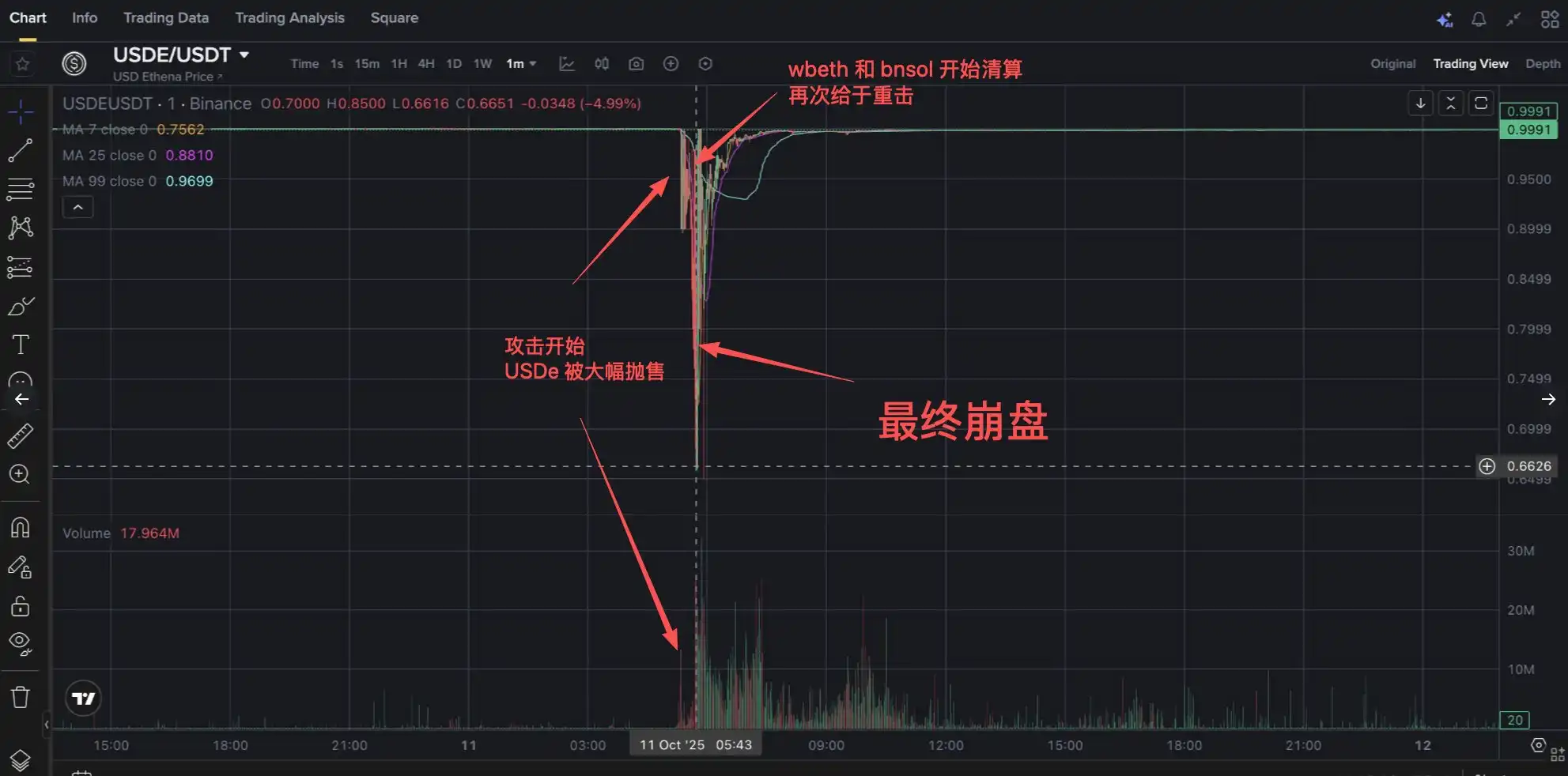 最終達到脫錨頂峰:USDe 0.65 wBETH 跌至$430,BNSOL 跌至$34.90