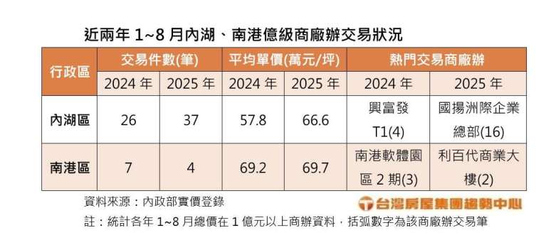 台灣房屋集團趨勢中心進一步統計,近兩年 1~8 月內湖及南港的億級商廠辦交易狀況,內湖今年成交 37 筆,較去年增加 11 筆;南港則自去年的 7 筆減至 4 筆,交易量略顯降溫。其中今年內湖最受矚目的為「國揚洲際企業總部」,單案即貢獻 16 筆交易,成為推升成交量的主力。南港則以「利百代商業大樓」為代表,今年成交 2 筆。