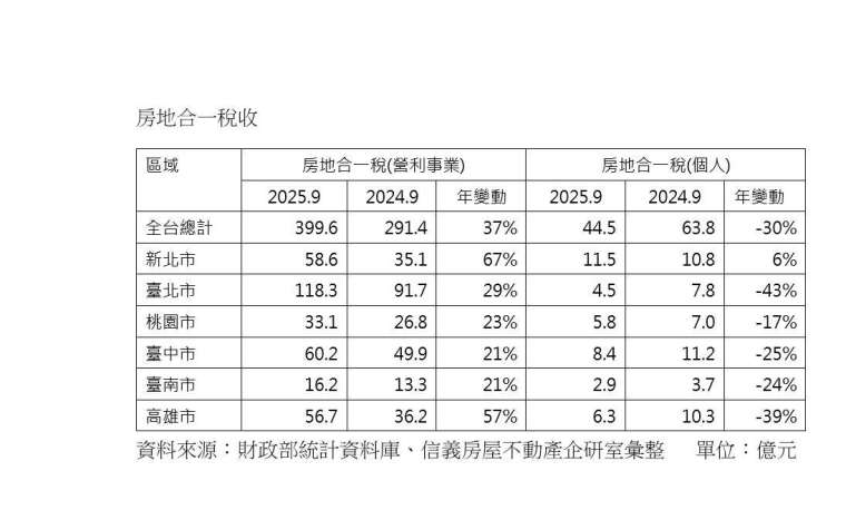 反觀 9 月個人房地合一稅,全台整體稅收 44.5 億元,較去年同期減少近三成,除新北市小幅成長 6% 外,其餘五都均呈衰退,跌幅最大為台北市年減 43% 與高雄市年減 39%。顯示市場觀望氣氛與房價高檔影響,交易動能明顯降溫。