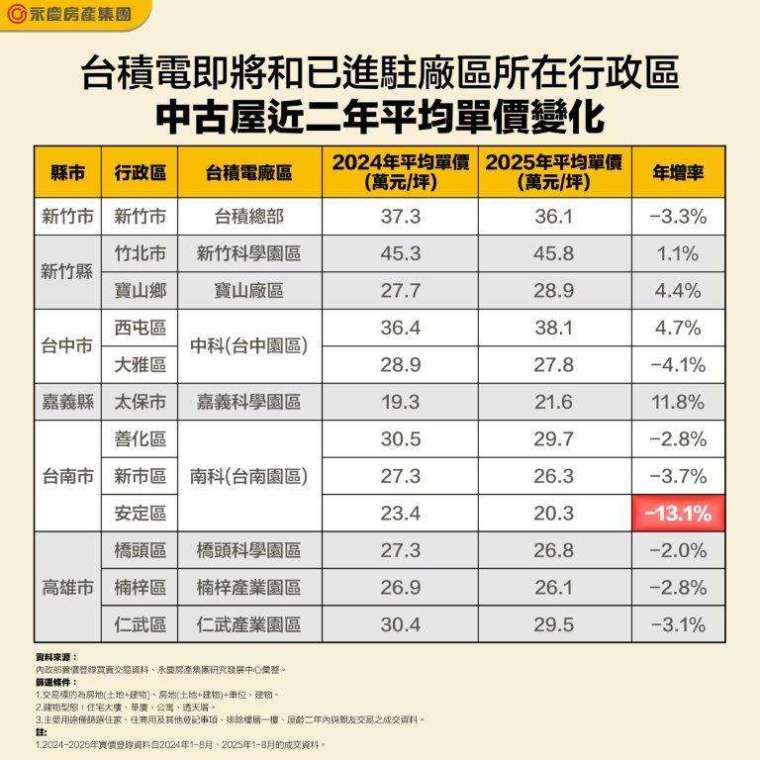 台積宅除了交易量明顯量縮外,部分區域房價也開始有所修正。陳金萍說明,南科台南園區近年來房價快速上漲,使不少購屋族已無法負荷,且該園區周遭房屋供給量大,隨著政策影響持續,不少投資客選擇退場轉售,使待售房屋供給增加。而且當地的交通、生活機能尚待完善,房價支撐性不足。數據顯示,安定區房價較去年共下修 13.1% 最高;新市區和善化區,房價也分別修正 3.7% 和 2.8%。