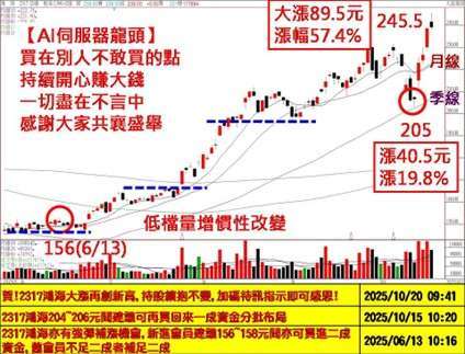 AI 伺服器龍頭【鴻海 (2317-TW)】:6/13 日 156 元帶著家族成員全力鎖定之後,10/15 日 205 元又買在別人不敢買的位置點上,今日就是持續上漲再創新高,一切盡在不言中;為什麼我敢買?為什麼我看好它?除了受惠於輝達 GB200+GB300 放量出貨,推升營收及獲利成長外,由於鴻海具有基板、模組、機櫃、散熱、組裝等一條龍解決方案,鴻海已開始開發輝達下一代 Vera Rubin 平台伺服器,規劃明年下半年量產出貨,相關業績一路看旺至後年;就如美系外資所言:由於鴻海已不只是組裝廠,未來更有獲利結構改善具可持續性、市場在上升周期中願意給予較高估值、即便 AI 產業資本支出波動但鴻海仍具成長韌性、在 iPhone 供應鏈中持續保持領導地位等四大優勢,因此,看好鴻海成功搭上 AI 趨勢列車,加上折疊手機及全球布局,外資高盛大幅調高目標價至 400 元,都幫我們來背書;如果每一次絕佳機會浮現時,你錯過了、或沒跟上腳步,下一檔低接機會在哪?歡迎來電洽詢,大師兄都會無私與大家分享。