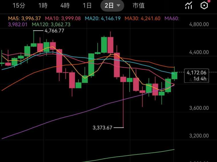 技術面上,ETH 於 10 月初觸及低點 3373 美元後持續築底,現已連續收復多條關鍵均線。MA5 上穿 MA10 形成短線黃金交叉,MA120(3046 美元)持續上揚,表明長期結構仍偏多。成交量同步放大,意味著主力資金重返市場。若 ETH 能穩定守住 4150 美元支撐區間,下一個技術目標區將看向 4500 至 4700 美元,屬於中期多頭重新啟動的結構型反彈。
