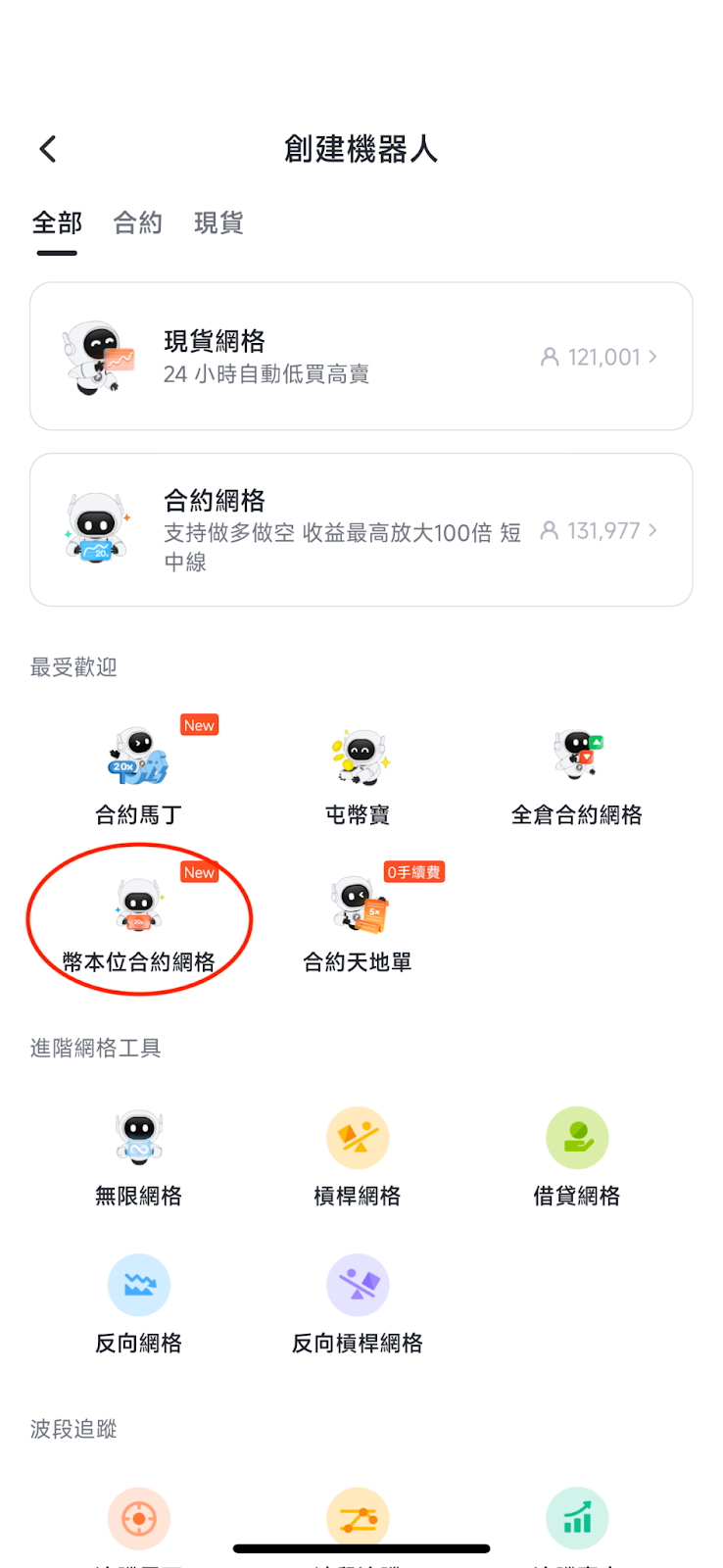 | 幣本位合約網格 | USDT 合約網格 | 幣幣合約網格 | |