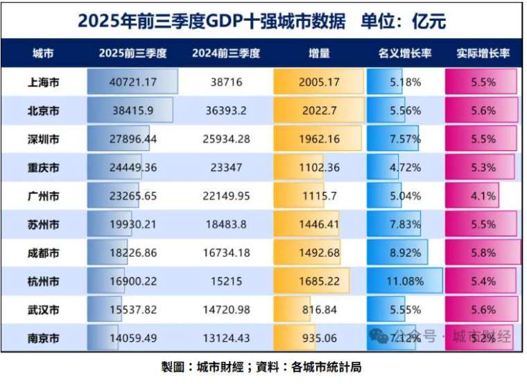 2025年前三季中國GDP十強城市 長三角表現突出 杭州增量受矚目