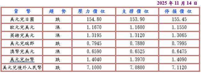 美國國會眾議院通過法案,由總統川普簽署後結束歷史上最長政府關門,讓停擺四十三天的聯邦工作人員最早週四重返工作崗位,市場轉向關注近期大量積壓的美國經濟數據,但美國經濟意外堅韌及美國聯邦準備理事會 (FED) 決策官員對進一步降息態度趨冷淡,提供美元支撐;此外,週四據路透調查,日本企業預計在新首相領導下,商業環境將改善,而且日本財務大臣片山皐月稱,日本公債主要由國內投資者持有,違約的可能性很低,但日本央行 (BOJ) 數據顯示,歸因於進口成本下降,日本 10 月企業物價指數 (CGPI) 較去年同期漲幅放緩至 2.7%,並據 BOJ 總裁植田和男表示雖然食品及非耐用品的需求減弱,但家庭收入增加及國內消費仍保持韌性,央行目標是實現伴隨工資上漲和經濟改善的溫和通貨膨脹,暗示與首相高市早苗重振經濟增長的重點一致,而且日本政府傾向要求央行避免利率上揚,促使投機客從近四十年來日圓最大規模多頭押注撤退,推動美元兌日圓觸及 155.01 高點。