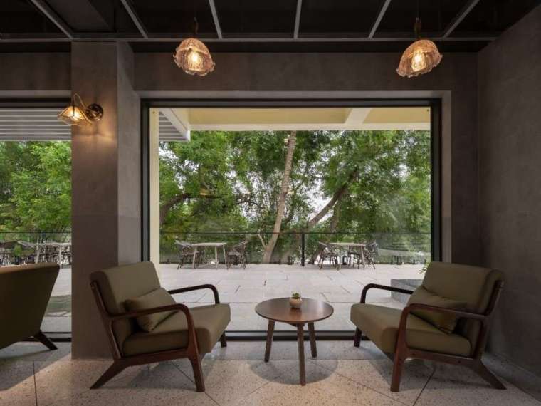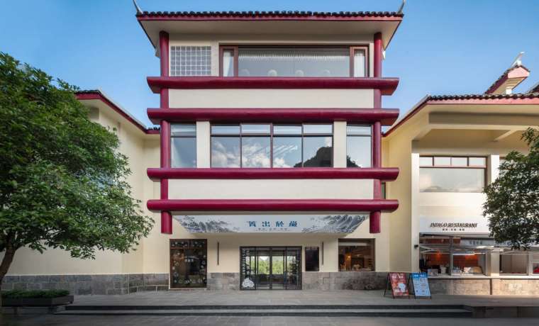 「移步換景」是「菁出於嵐」的核心敘事。入口以百花園鋪展自然氣息,透過窗景借景,彷彿走進流動的山水畫卷。B1 層因依山結構而有連續柱體,設計師以連續拱門統合視覺,使原本破碎的空間轉為完整的節奏,並以碎形理論演繹:單一拱門是一處風景,串聯後即成宏觀的景觀帶。文創館以紅花磚與藍染繡球象徵地方民族文化,將藝術工藝轉譯為當代語境。餐飲空間則透過青磚灰與紅磚色營造暖意,輔以品牌色靛藍於軟件點綴,形塑獨特的視覺符號。南側古牆的保留,使建築與遠山景致合繪成一幅畫,成為訪客駐足的打卡新地標。整體設計不僅滿足營運機能,更讓空間成為體驗陽朔人文與自然的交匯點。