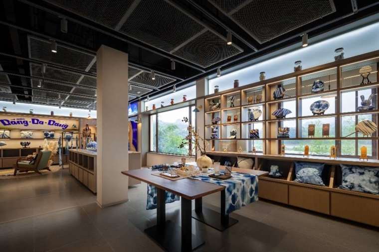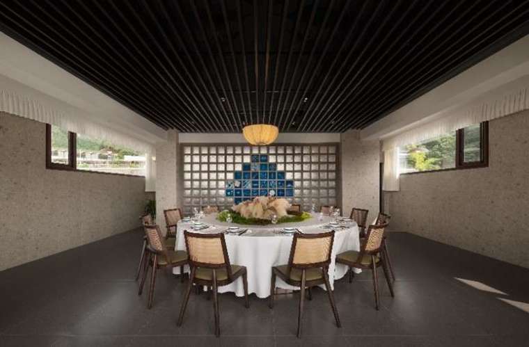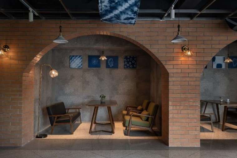 色彩基調以青磚灰、白與紅磚色交織,營造溫潤沉著的氛圍,尤其在餐飲區以暖色調喚醒味覺。設計師將靛藍作為品牌象徵,於軟裝、布藝與細節上點睛,呼應藍染文化。材質上採用在地建材轉化灰的多重層次,於不同角度形成疊影。紅花磚的紋理、藍染繡球的符號,皆以工藝語彙連結在地文化。整體色彩與材質的安排,既為場域注入地域性,又使空間在日夜光影中展現靈動的表情。